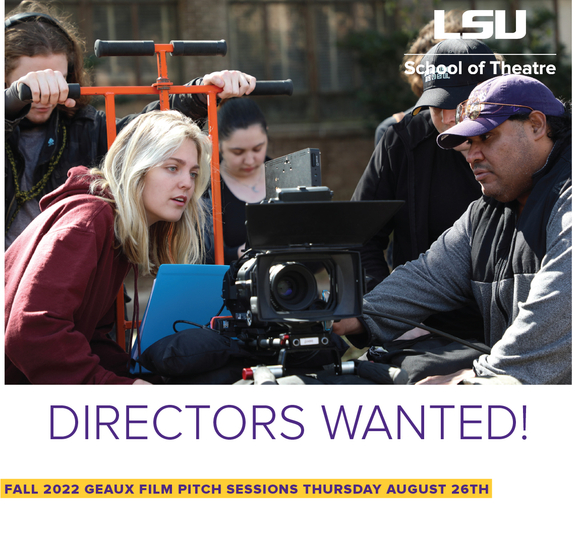 The pitch sessions for the fall Geaux Film will be held on Thursday, August 25th from 4:30pm until 6:00pm. The Geaux films this year will have a budget of $3,000.00 each (with a separate food stipend) provided by the School of Theatre. Pitches must include a preliminary budget, known crew positions and a script outline. A finished script is recommended. To sign up for a seven-minute slot select a slot and add your name to this excel form: https://1drv.ms/x/s!Aih_r0l9PrvrlUiNKCIqDQ3Xsxe0. (If you have any problems signing up contact Vastine Stabler.)