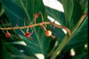 -Simple leaf, lanceolate to 18 inches long by 4 inches wide, alternating along stem in a single plane, dark green, semi-glossy, aromatic when brushed