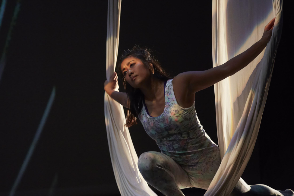 “It was a very different experience, prioritizing this movement and art in my life for the summer,” Reeny said. “At the surface level, movement is a great form of exercise and relief from the stresses of preparing for medical school. But at one point in rehearsing for Savage/Love and seeing the scientific projections behind us, I just had to stop for a moment to think how cool this is, that our bodies can do these things, flow through the silks in the air. Everything in our bodies, down to the smallest cells and even individual atoms, have to function correctly and contribute to a giant system in order for us to move the way we do. I go to my science classes and we talk about facts, but when performing aerial, I have to connect emotion to what I know scientifically about the human body and the physics of movement.”